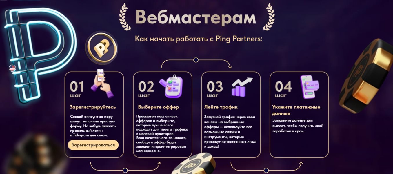 Ping.Partners — рабочий вариант для тех, кто ищет гэмблинг-партнёрку с низким порогом входа, честными выплатами и живой командой на связи. Не самая большая сеть на рынке, но именно это иногда и нужно: меньше бюрократии, больше скорости.